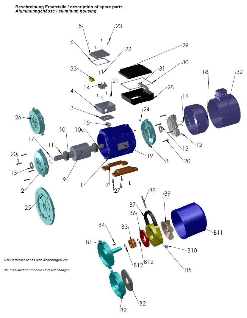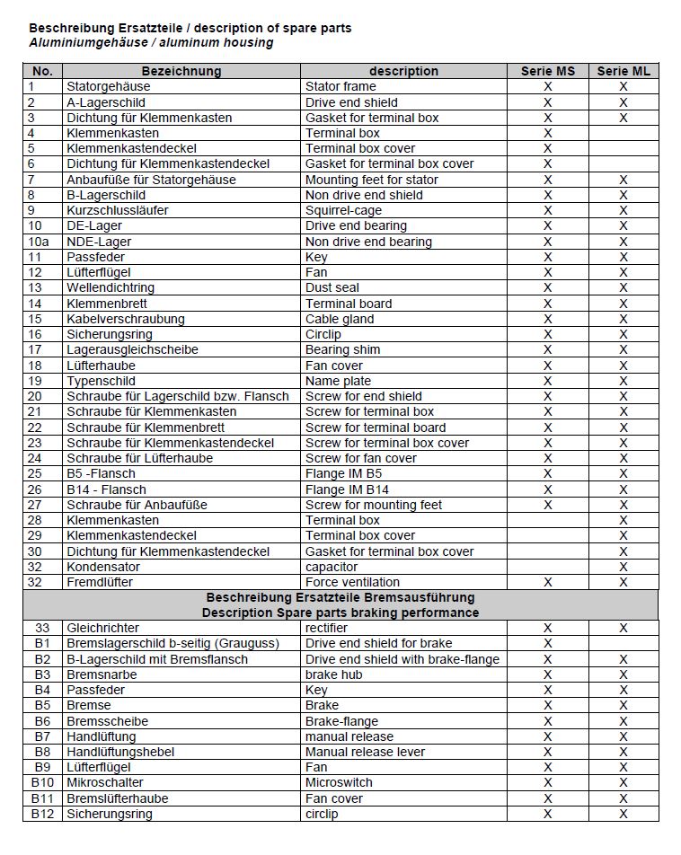 Alumiinista valmistettujen sähkömoottoreiden / jarrumoottoreidenvaraosia on luonnollisesti saatavilla. Koska niitä ei ole lueteltu kokonaisuudessaan verkkokaupassa, niitä on pyydettävä sähköpostitse. Räjähdyskuva, jossa on varaosien yleiskuvaus, on erittäin hyödyllinen vastaavan artikkelin nimityksen löytämiseksi. Nämä tiedot löytyvät myös vastaavista käyttöohjeista.