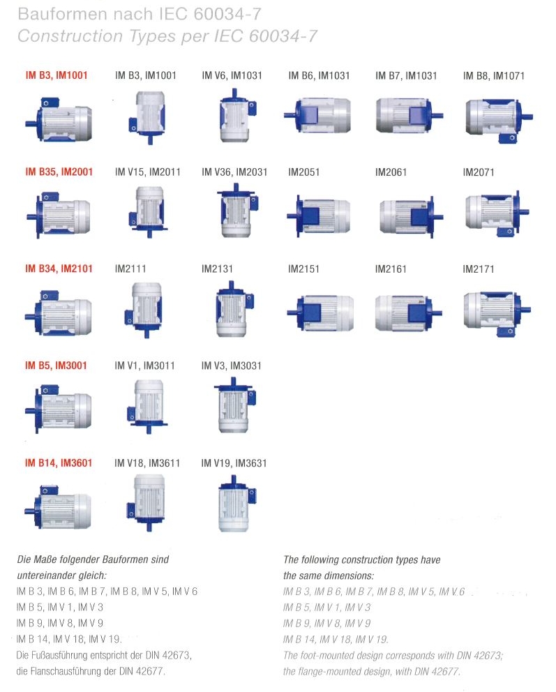 Mallit merkitään kansainvälisesti standardoidulla IM-koodilla. IM tarkoittaa kansainvälistä asennusta. Tässä koodissa otetaan huomioon moottorin akselin sijainti, päätykilven tyyppi, voimansiirron asennus, voimansiirtoakselin rakenne ja moottorin asennus.