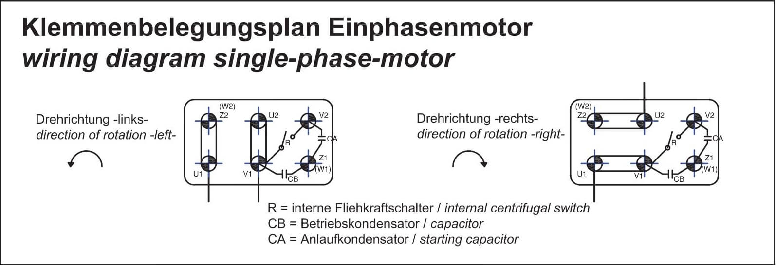 Täältä löydät yksivaiheisen moottorin yleisesti voimassa olevan kytkentäkaavion. Vertaa tätä liitäntäkotelon kannessa olevaan kytkentäkaavioon. Jos on poikkeamia, ota meihin yhteyttä.